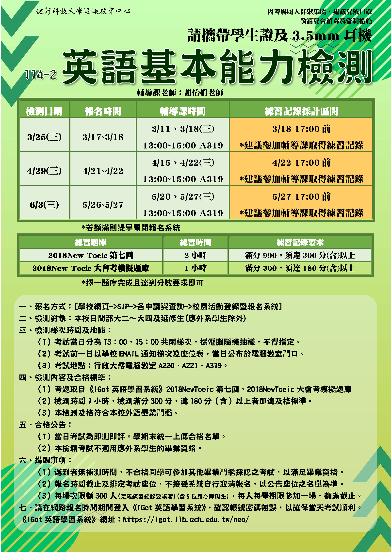 (2)檢測時間1小時,檢測滿分300分,達180分(含)以上者即達及格標準,符合本校外語畢業門檻。