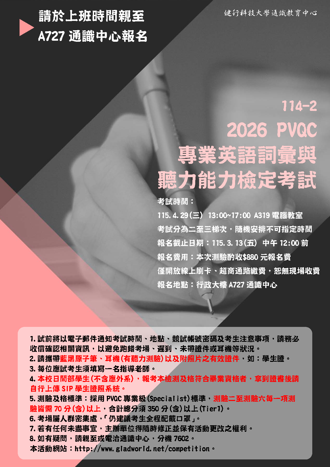 1.試前將以電子郵件通知考試時間、地點、競試帳號密碼及考生注意事項,請務必收信確認相關資訊,以避免跑錯考場、遲到、未帶證件或耳機等狀況。