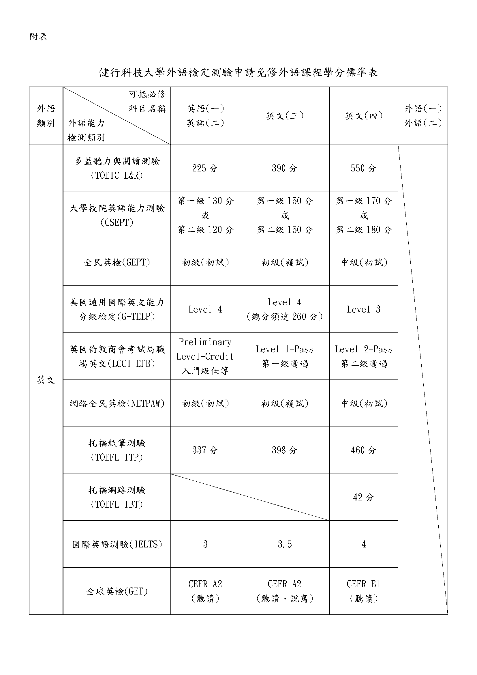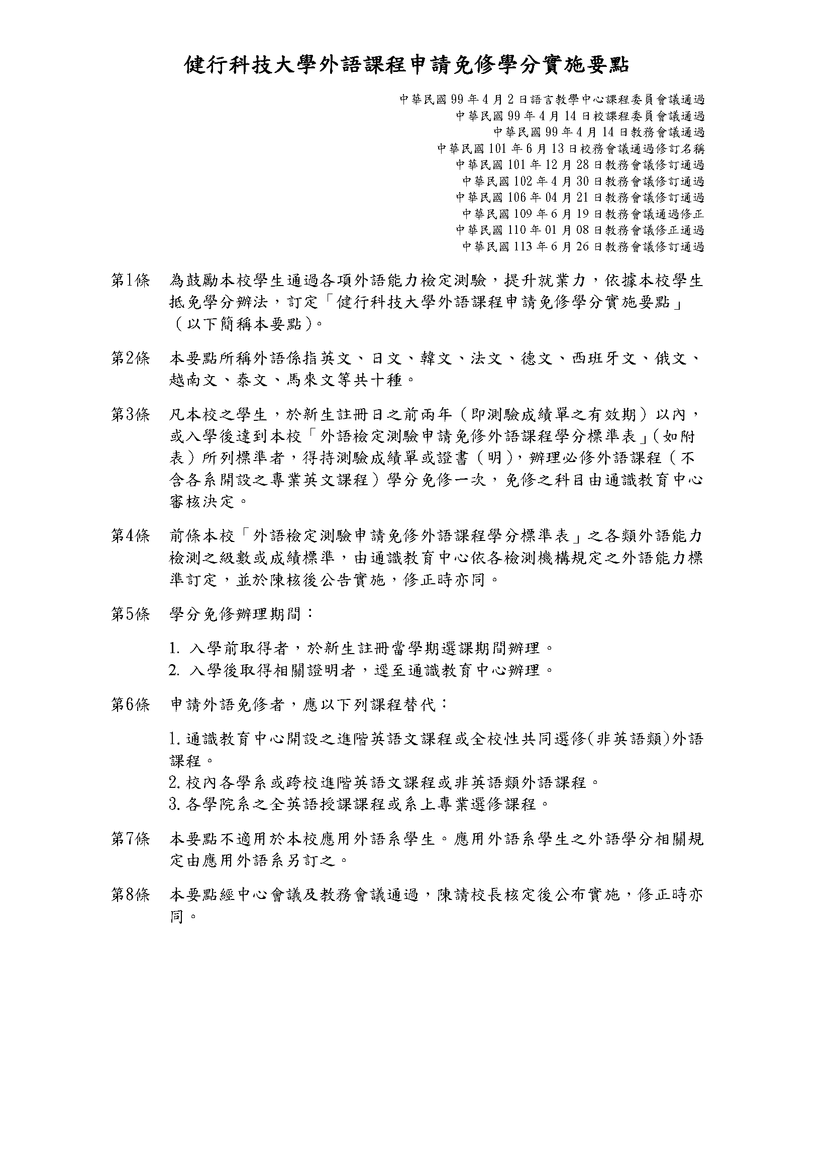 為鼓勵本校學生通過各項外語能力檢定測驗,提升就業力,依據本校學生抵免學分辦法,訂定「健行科技大學外語課程申請免修學分實施要點」。