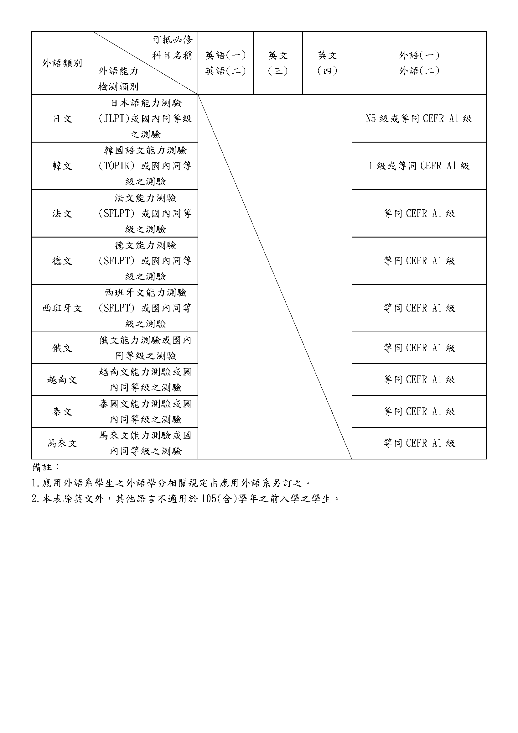 凡本校之學生,於新生註冊日之前兩年(即測驗成績單之有效期)以內,或入學後達到本校「外語檢定測驗申請免修外語課程學分標準表」(如附表)所列標準者,得持測驗成績單或證書(明),辦理必修外語課程(不含各系開設之專業英文課程)學分免修一次,免修之科目由通識教育中心審核決定。